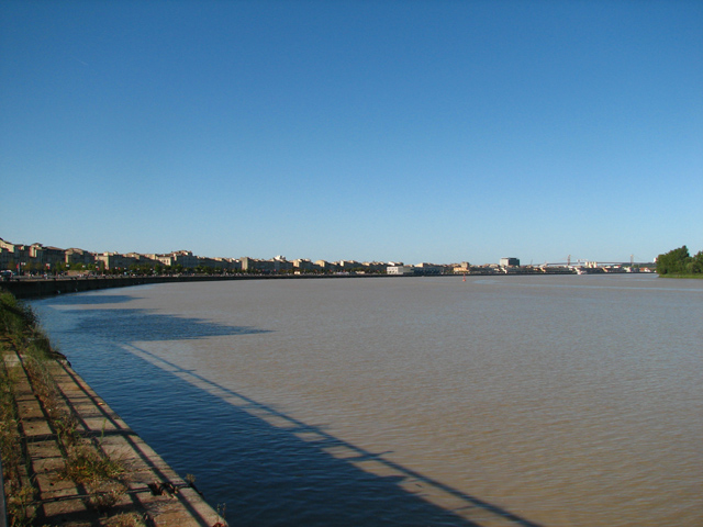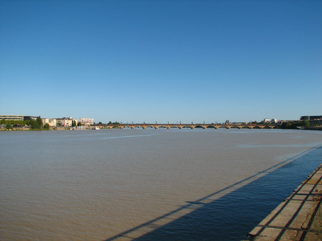 Vu depuis le Port de la Lune ou port de Bordeaux, vers la Garonne et le pont de Pierre - Bordeaux, France