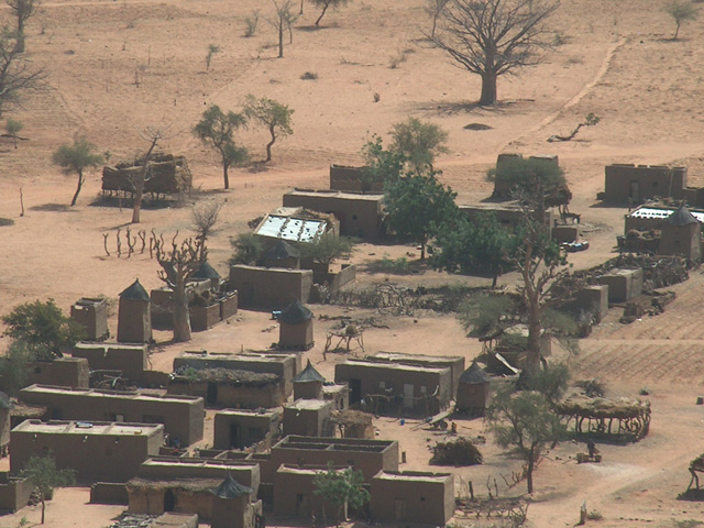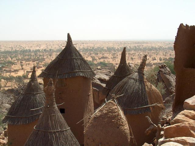 Dogon cases and view to the sandy Séno-Gondo Plains, central plateau region of Mali, southeast of the Bandiagara cliff