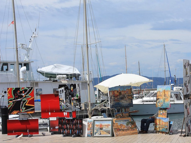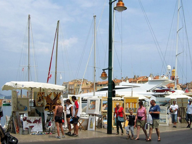 Paintres au bord du port de Saint-Tropez avec vue sur la baie et les yatchs. Saint-Tropez, Var, France.