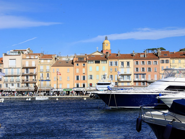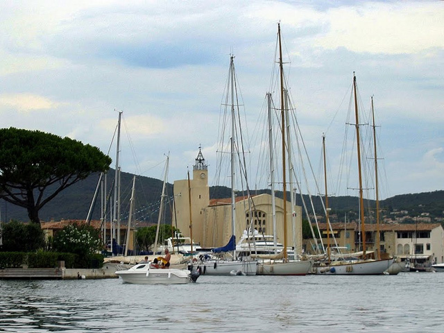 Autour du port de Saint-Tropez avec l'église de Saint-Tropez au loint - Saint-Tropez, Var, France