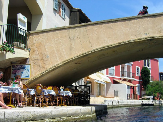 Restaurant le long d'un canal a Port Grimaud, cité lacustre sur la commune de Grimaud, dans le Var, en France