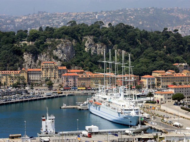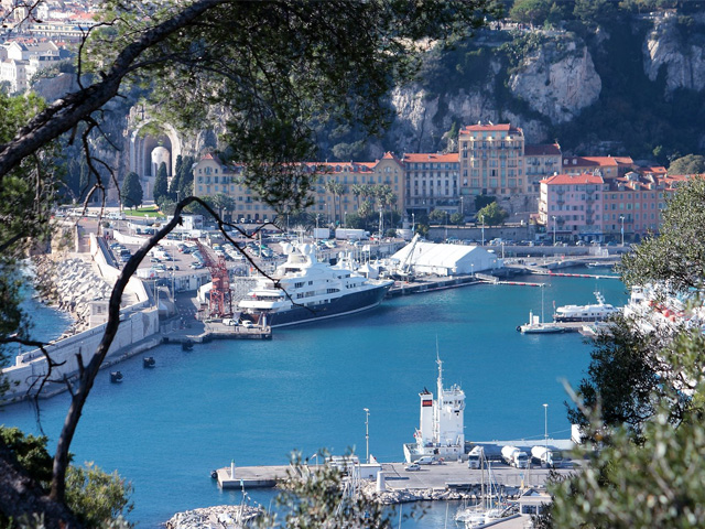 Vue sur port Lympia avec la colline du château au fond - Le port Lympia est le nom donné au port de la ville de Nice, en France